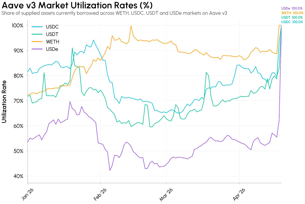 Aave v3 市场利用率百分比(以USDC、USDT、WETH、USDe为基准)。来源:Talos