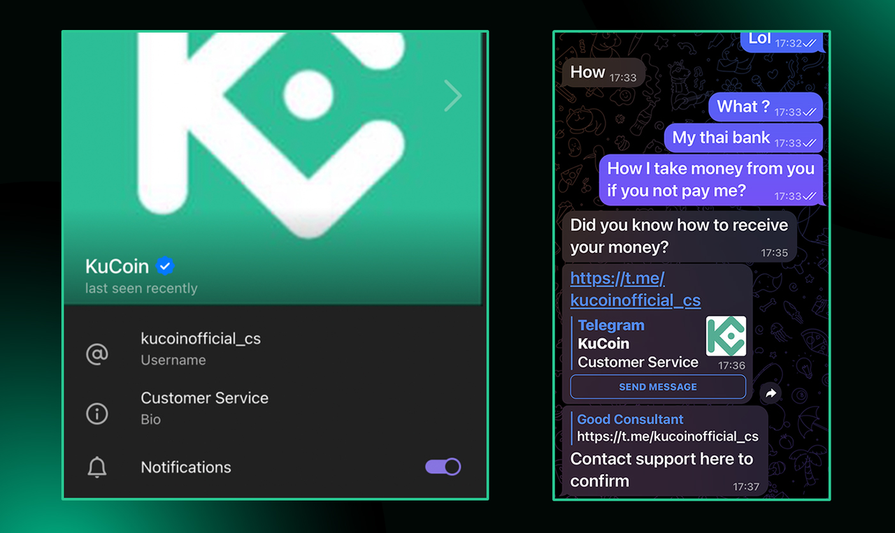 「我是 KuCoin VIP 經理,提供 100 倍保證回報!」→ 用戶傳送加密貨幣 → 騙子:「恭喜,您現在是 VIP 奪羊了!」