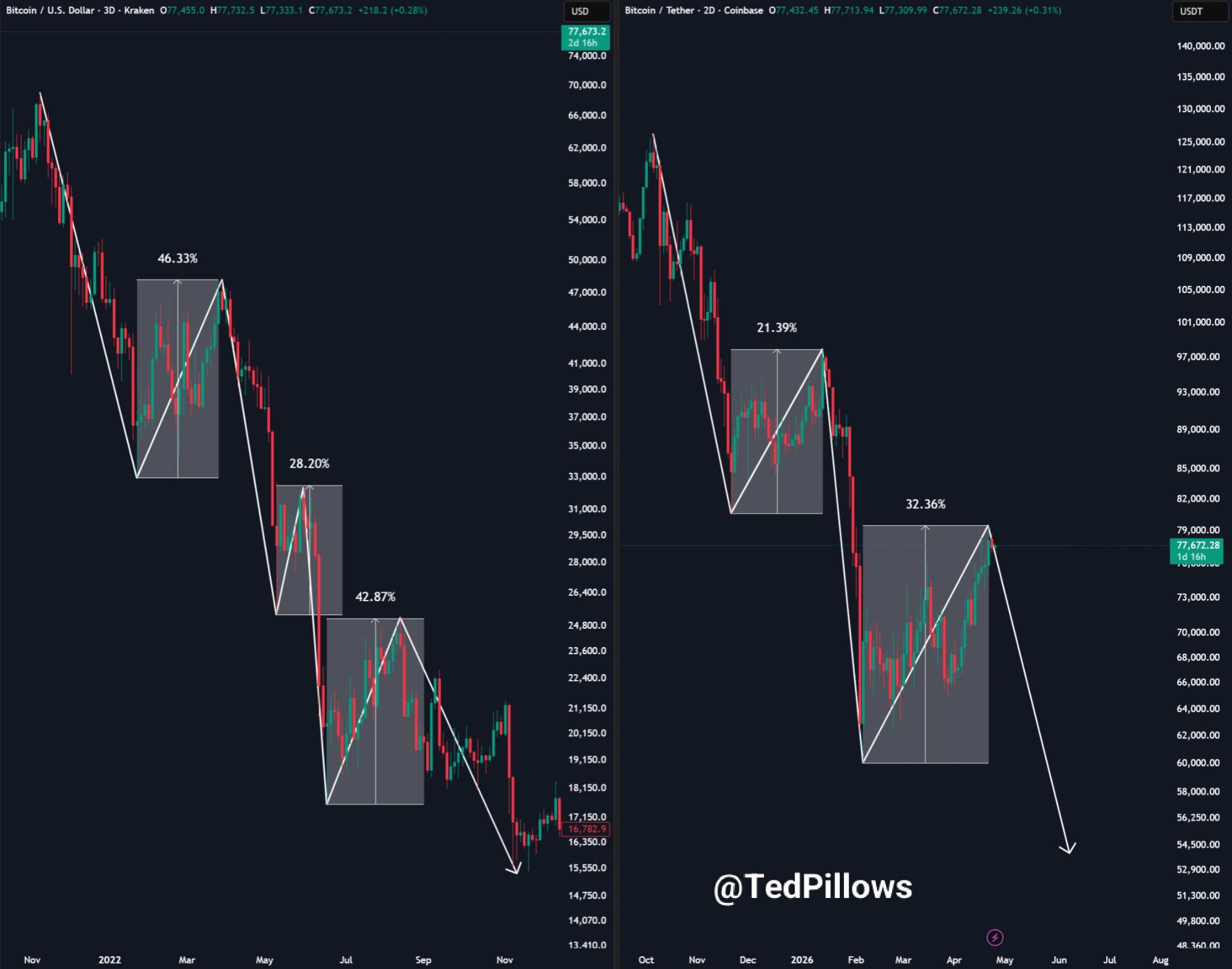 他的分析指出,過往週期中曾出現重複的「逐步下行」循環,即劇烈下跌後會出現短暫反彈,隨後繼續下跌。今日市場趨勢同樣表現出反彈後進入盤整的特徵,這讓人質疑當前的反彈是否具有持續性。