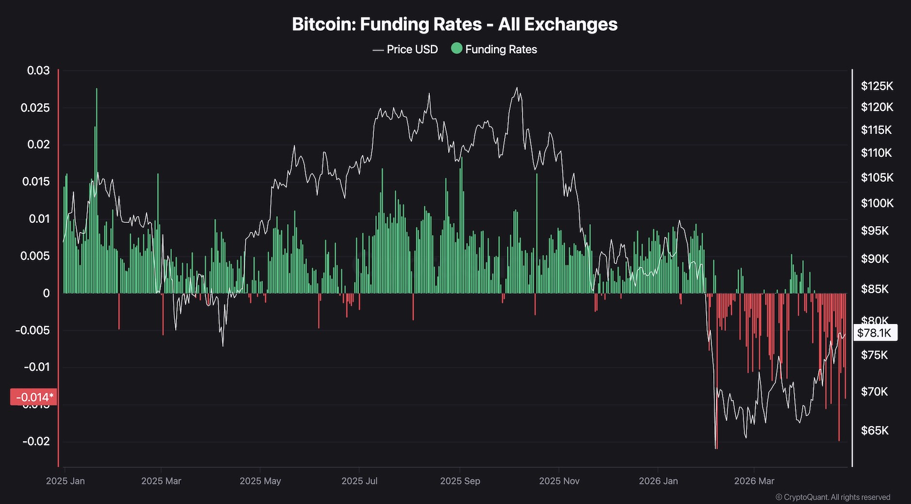 從情緒角度看,資金費率圖表呈現出一個悖論。儘管 BTC 的交易價格已達到 78,000 美元,為二月以來的最高水平,但所有交易所的資金費率仍維持在負值,目前約為 -0.014。自二月開始的紅色柱狀圖主導局面仍未解決,即使價格已從低點上漲超過 20%。交易員仍需支付費用以持有短倉,而此時價格已接近兩個月來的高位。
