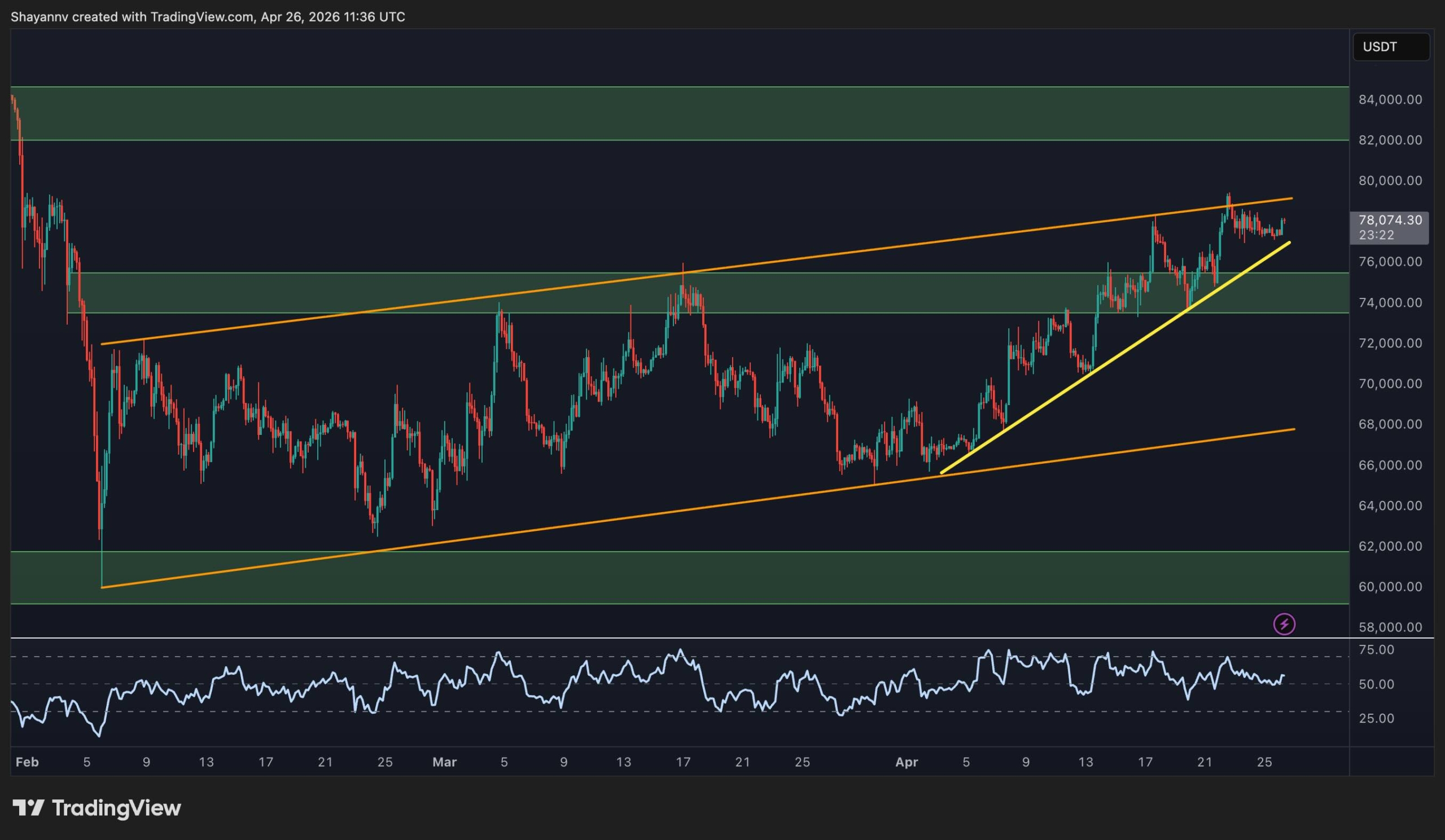 4 小時圖表已形成一個有趣的雙層結構。自二月低點延伸的較大上升通道框定了整體的反彈,而四月初出現的更陡峭短期趨勢線則成為近期上漲的實際動力,將價格從約 $68k 推升至目前近 $78k 的水平,耗時三週。