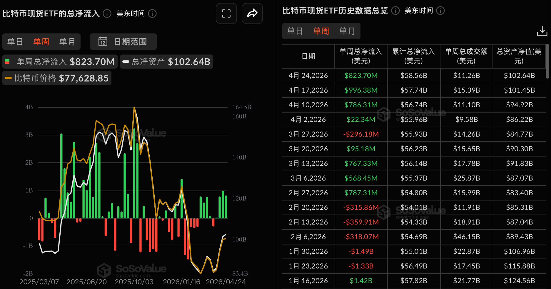 ME News 消息,4 月 26 日(UTC+8),根據 SoSoValue 數據,上周交易日(美東時間 4 月 20 日至 4 月 24 日)比特幣現貨 ETF 凈流入 8.24 億美元。