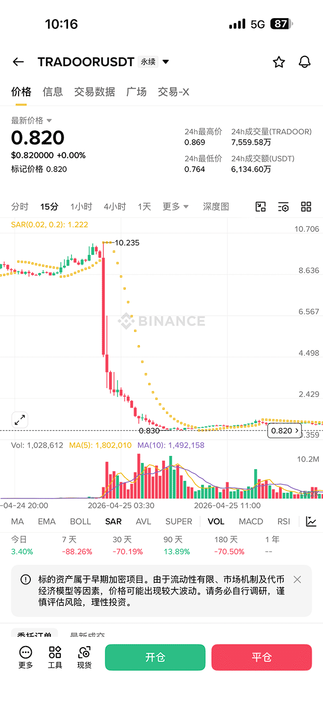 4月25日凌晨,$TRADOOR代币在短短30分钟内从高点急杀90%(从$300极速下杀到$25),90天累积的900%涨幅几乎归零。链上分析师Specter在X平台发布调查资料,指控这是一起有预谋的供应集中与出场操作。