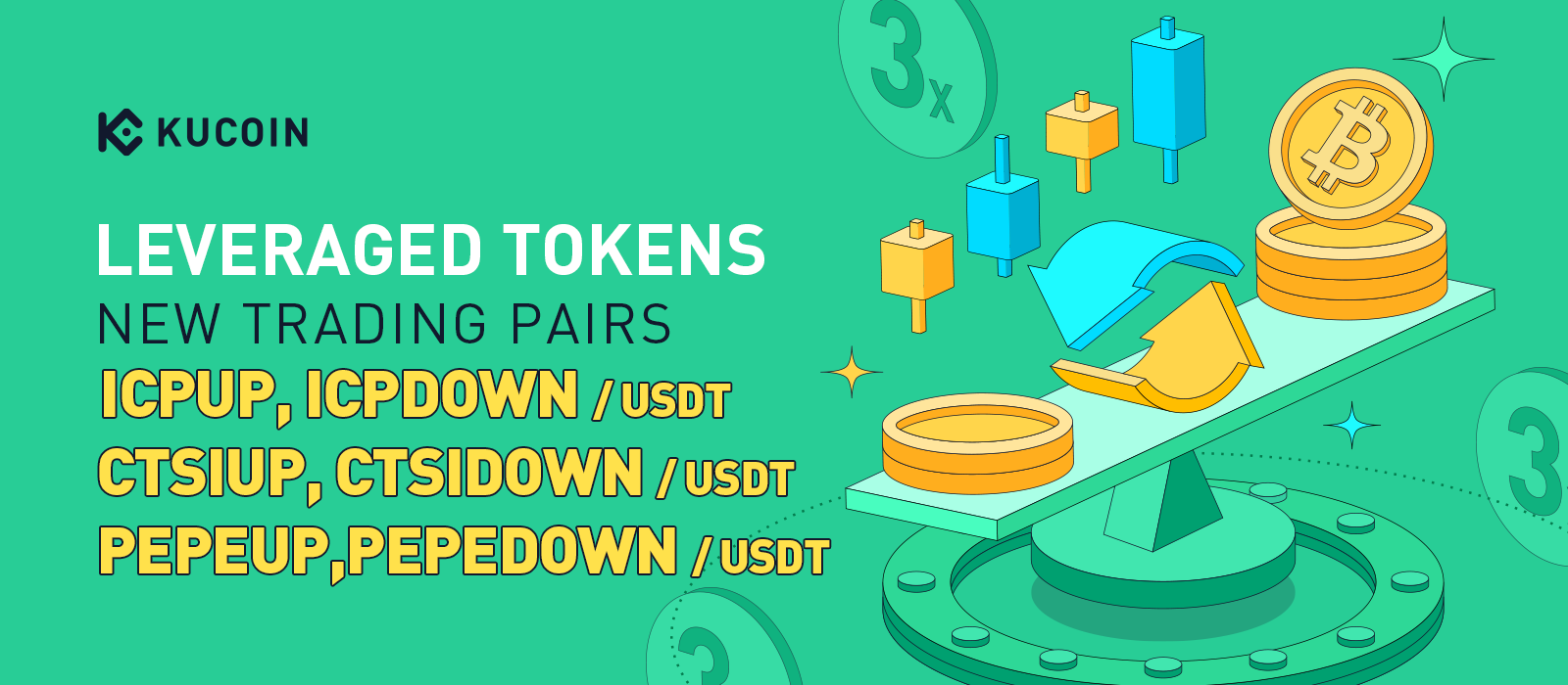 To enrich the variety of assets available on KuCoin‘s Leveraged Tokens (ETF) market, we have addedICPUP,ICPDOWN,CTSIUP,CTSIDOWN,PEPEUP,PEPEDOWN.