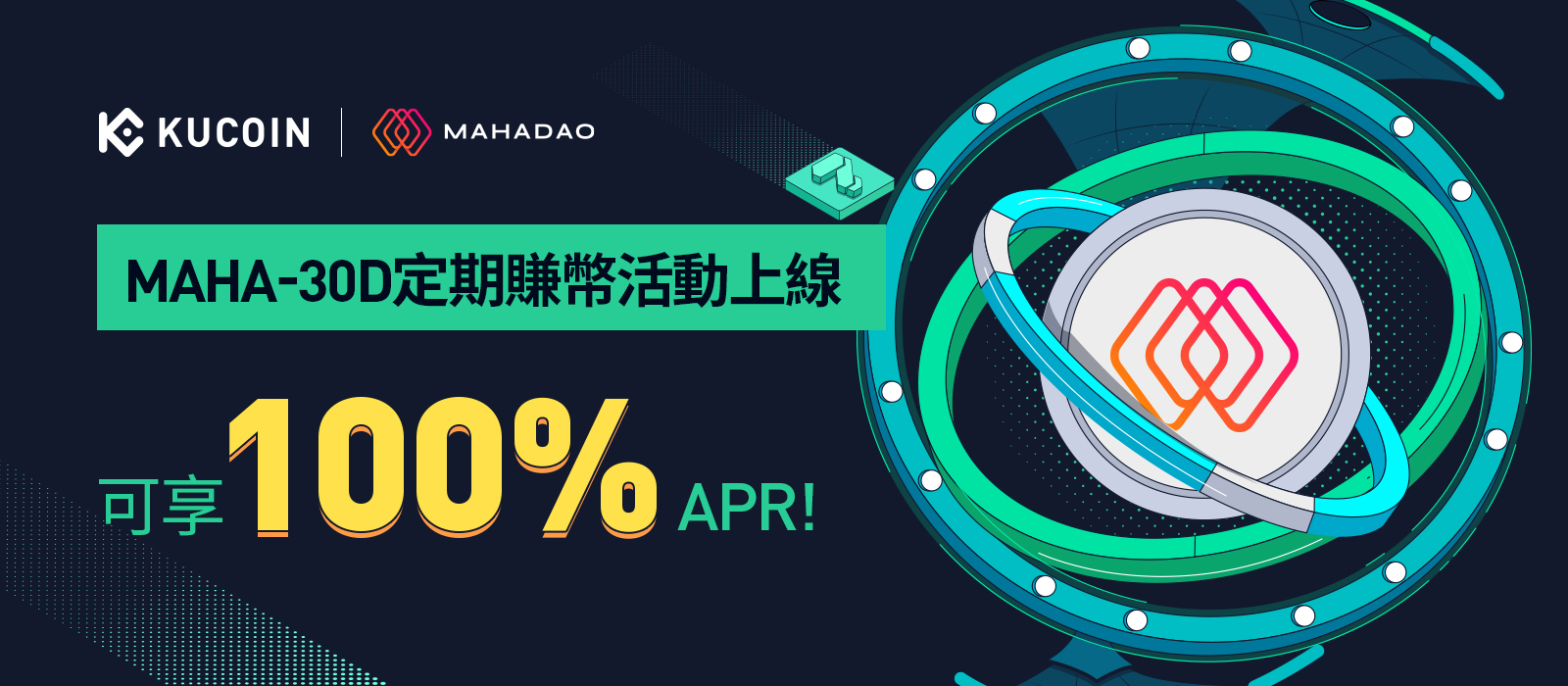 KuCoin賺幣平台將於2023年2月23日18:00:00 (UTC+8)上線MAHA定期賺幣活動,本次上線產品MAHA-30D享100%福利!填寫表單報名並參與質押,質押金額最高10個用戶將分別獲得1個People Of Eden NFT獎勵!