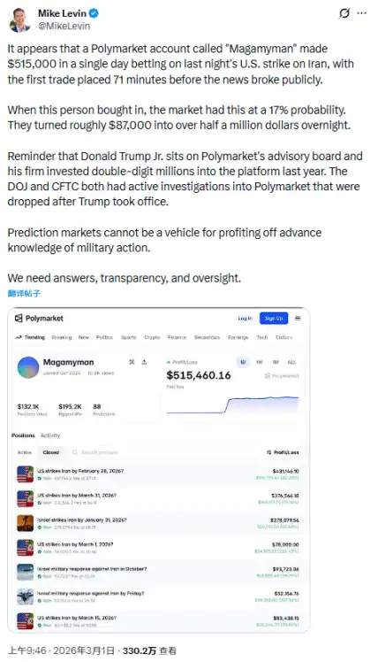 此外,Mike Levin 在社交平台 X 上發文披露,上述六個帳戶中,名為「Magamyman」的 Polymarket 帳戶單日獲利 51.5 萬美元,其首筆交易發生在相關新聞公開披露前 71 分鐘。