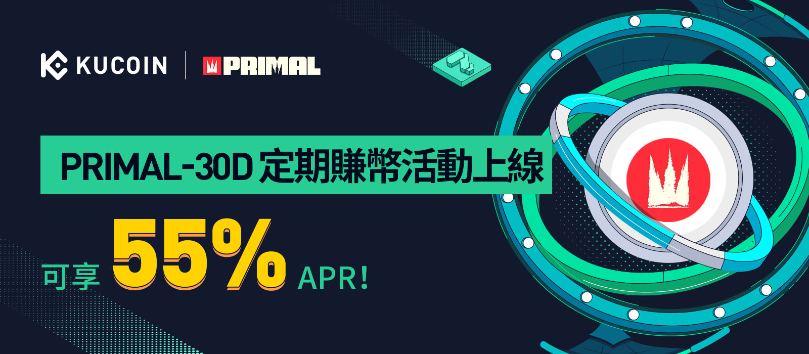 KuCoin賺幣平台將於2023年2月9日18:00:00 (UTC+8)上線PRIMAL定期賺幣活動,本次上線產品PRIMAL-30D享55%福利!
